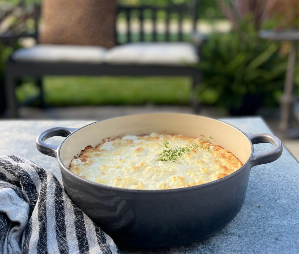I recently threw my sweet husband a 60th Birthday Party at home…Louisiana Style! Steven and a couple of his best friends from New Orleans boiled more Louisiana shrimp and crawfish than you could “shake a stick at,” but I also included some additional party menu items for guests to enjoy. I had so many requests for the Hot Onion Souffle’ Dip and Orzo Salad recipes that I decided to share them here on my blog! Disclaimer: I will do my best to replicate the Orzo Salad for you. Not only did I not get a picture of it (it’s a really pretty salad, btw), I didn’t really follow a proper recipe for it. I just sort of “made it up”. But that’s the beauty of the Orzo Salad…you get to improv it depending on what’s fresh at the market or what’s in your frig! The Hot Onion Souffle’ Dip? Absolute no-brainer party dip for any time of the year!