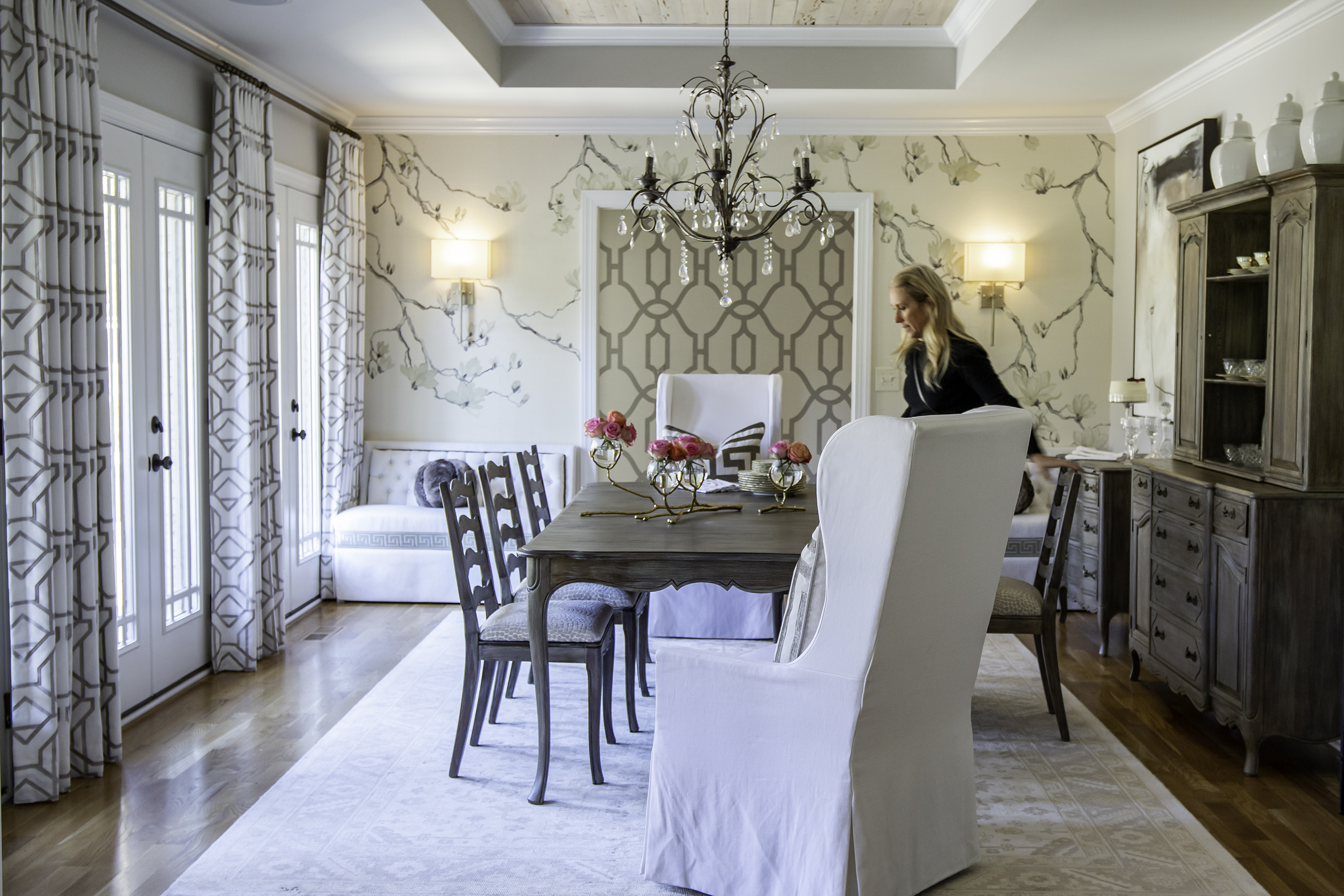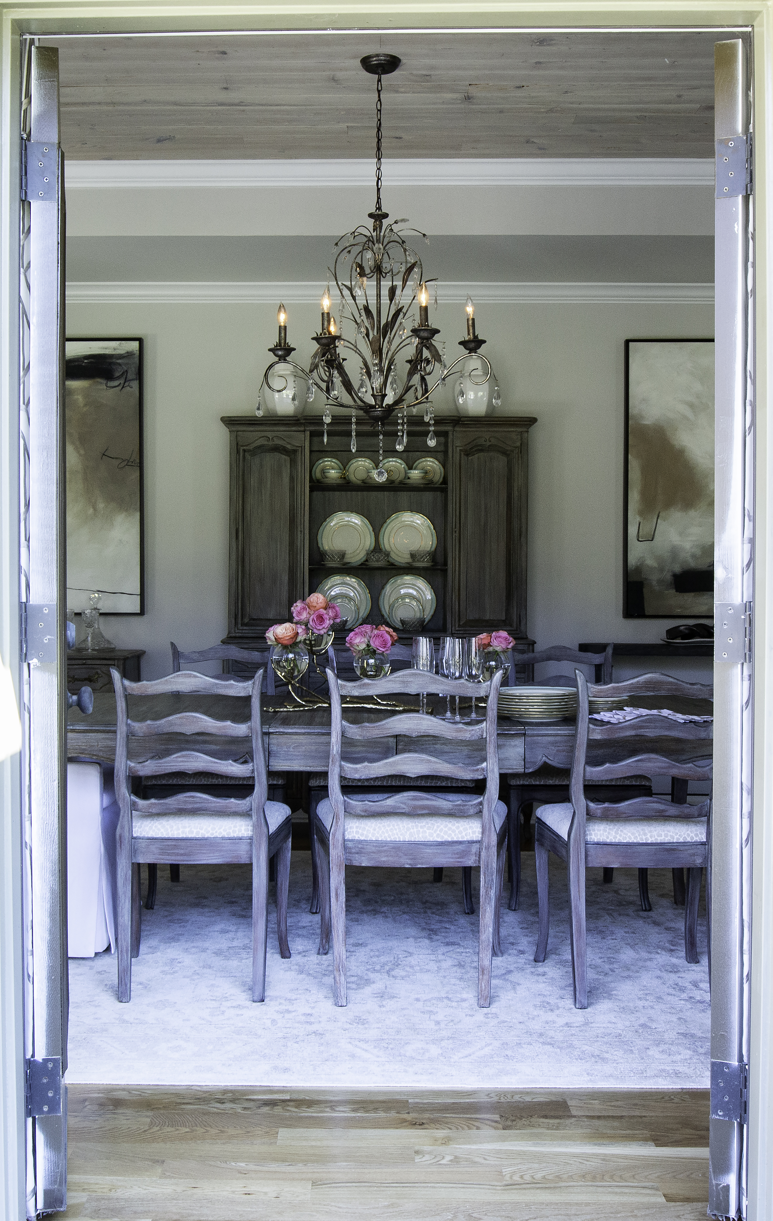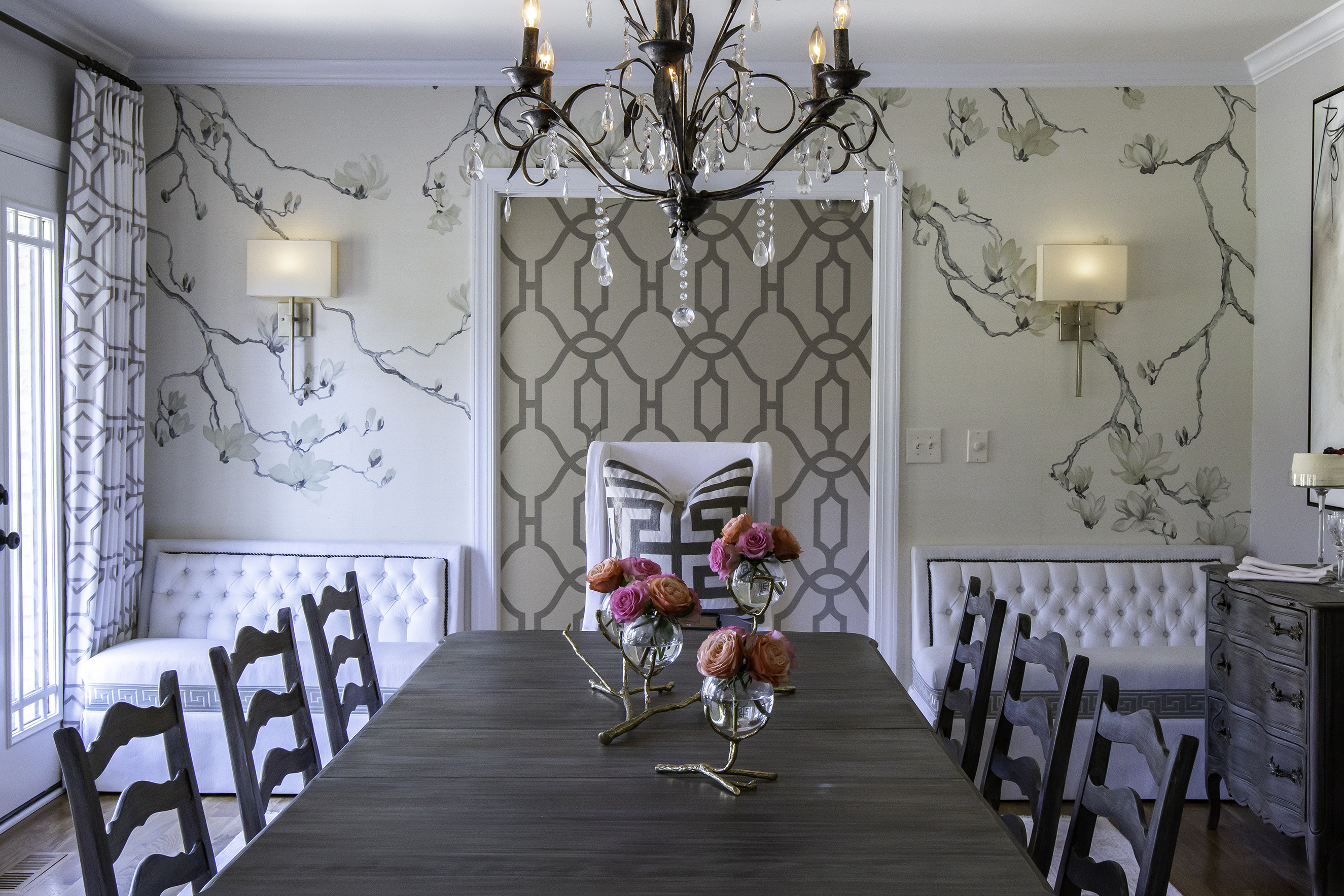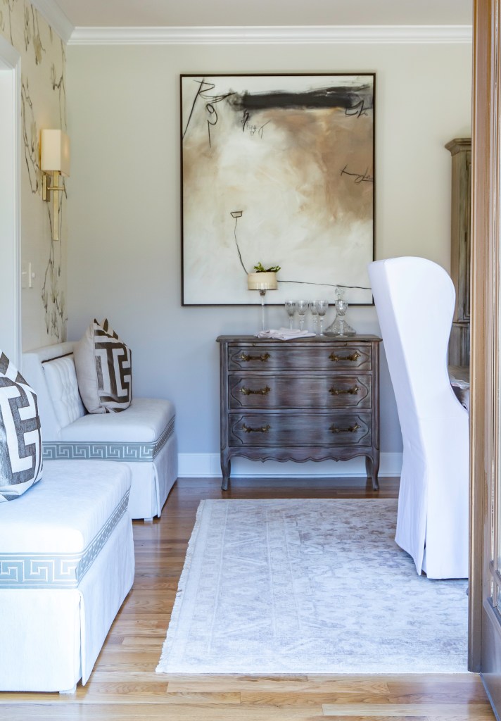 Soft layers create this maximalist dining space. The client’s vision began with her grandmother’s dining table, wooden ladder back side chairs, china and china cabinet. We then mixed in florals, abstracts, custom upholstery and pecky cypress details to create a luxurious room that is both old and new, masculine and feminine, classic and modern and 100% Grand Millennial!