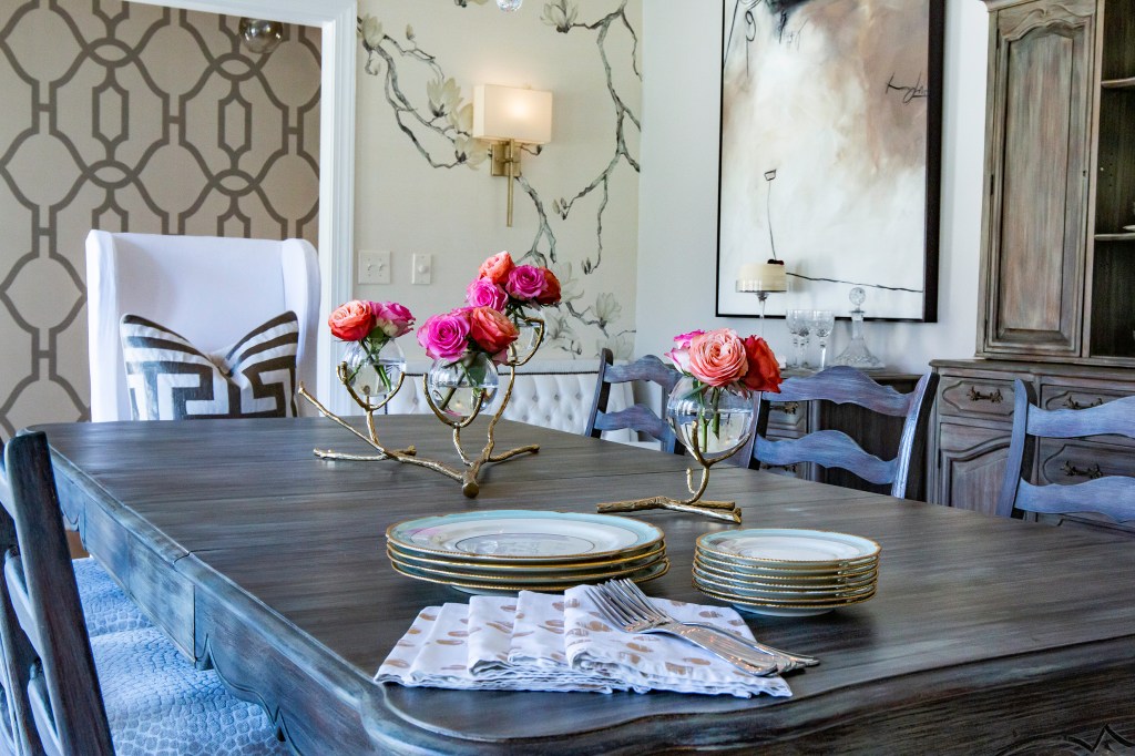 Soft layers create this maximalist dining space. The client’s vision began with her grandmother’s dining table, wooden ladder back side chairs, china and china cabinet. We then mixed in florals, abstracts, custom upholstery and pecky cypress details to create a luxurious room that is both old and new, masculine and feminine, classic and modern and 100% Grand Millennial!