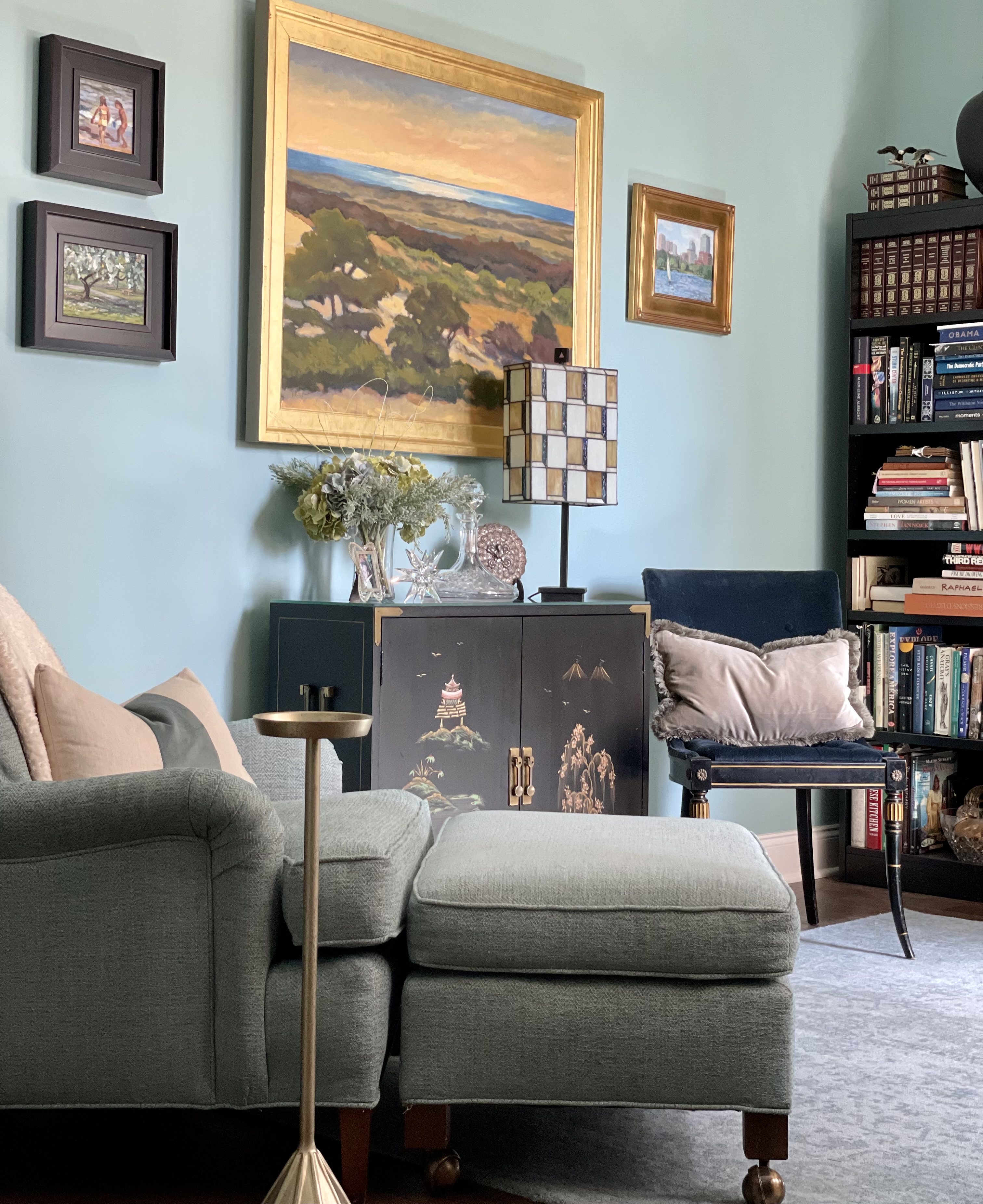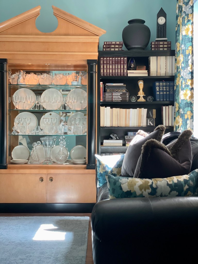 The library is the homeowner’s favorite room in the house, as it incorporates some of her late husband’s most cherished books, artifacts and memorabilia. It’s deep and luscious and the perfect balance of masculine and feminine, bright and moody, leather and velvet. It’s also home to her precious china and stemware collection housed in a stunning cabinet, something she really hoped she’d be able to keep! It works perfectly here between the dark bookcasing and creates a striking contrast and focal point. All furnishings were brought from her previous residence and were either reupholstered or refreshed with pillows. Win win and win some more!