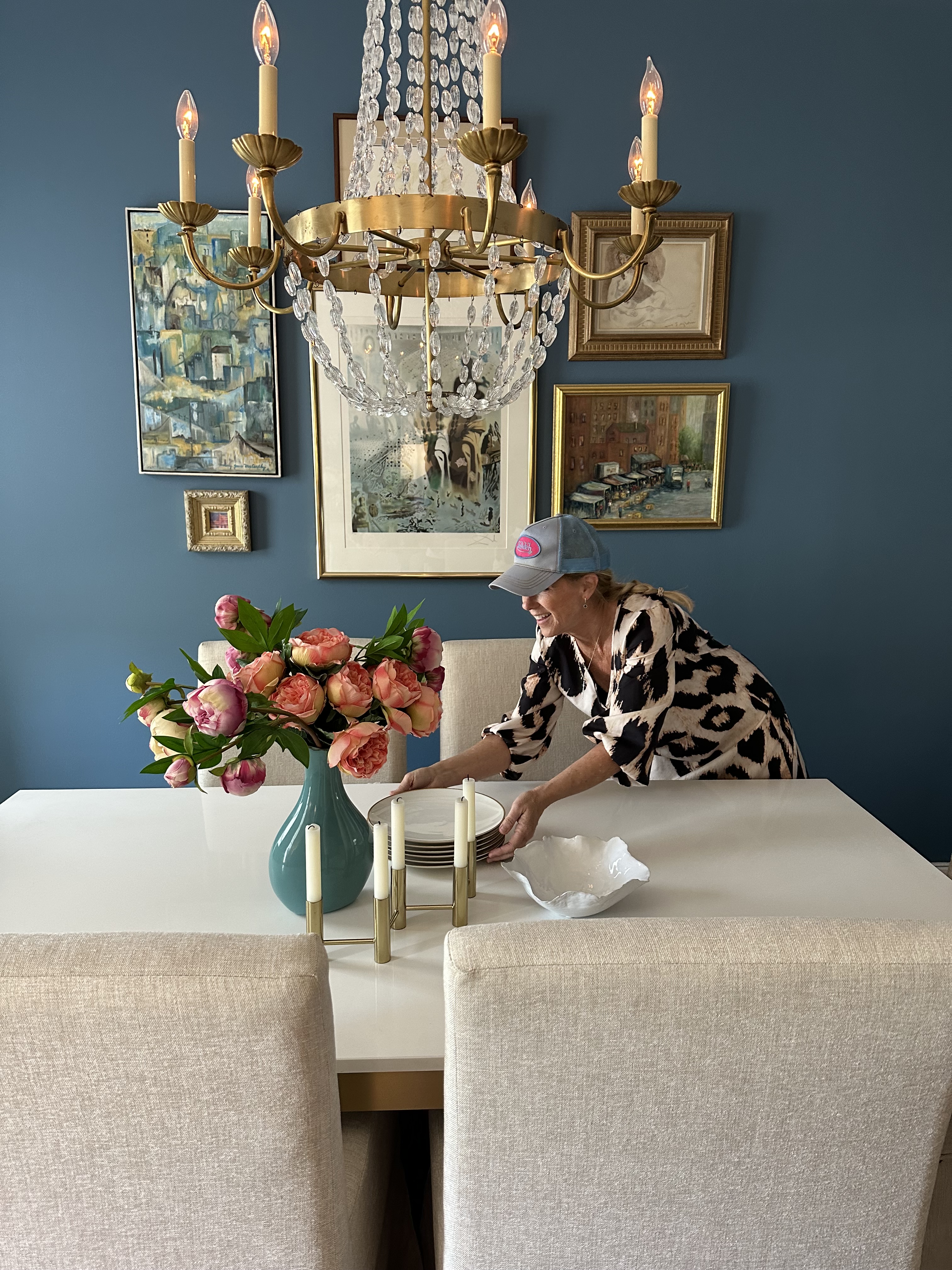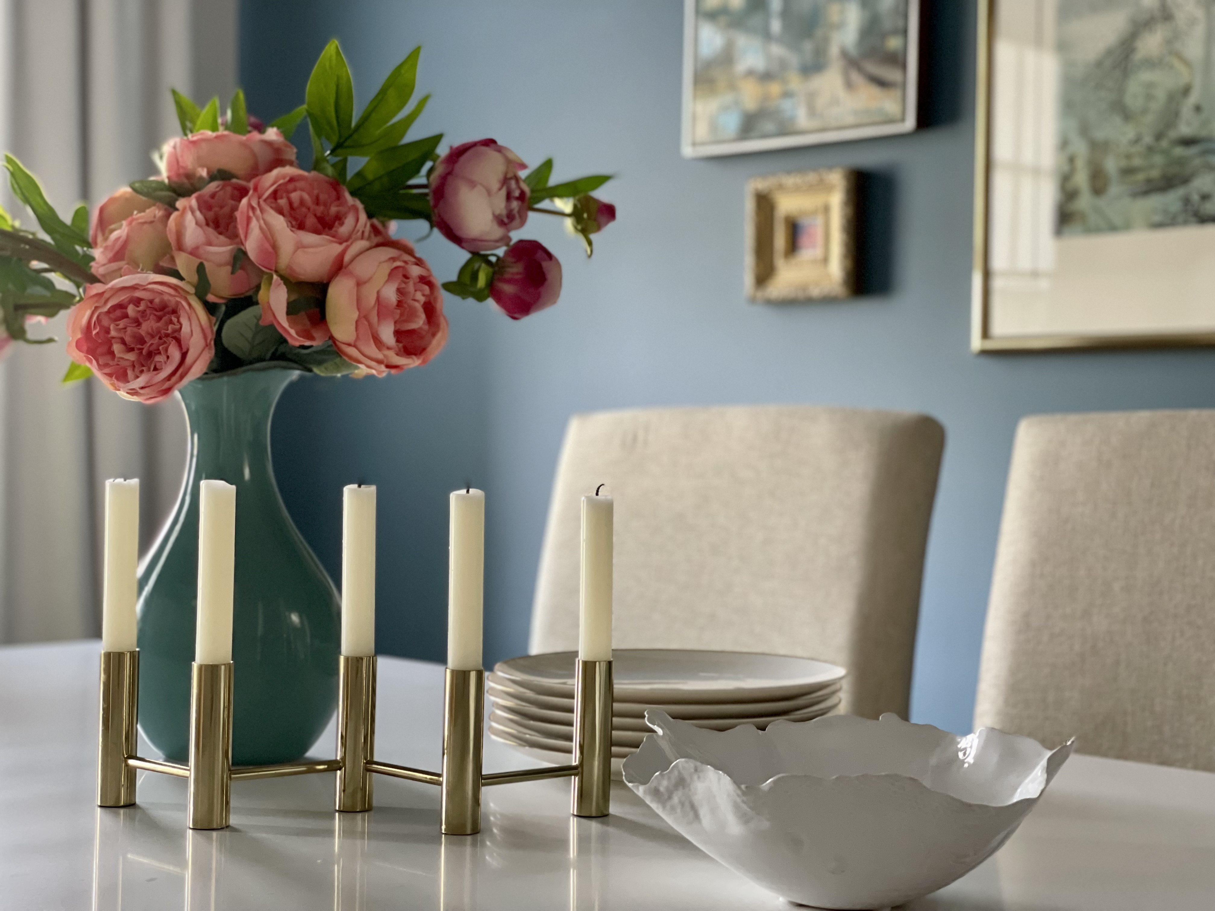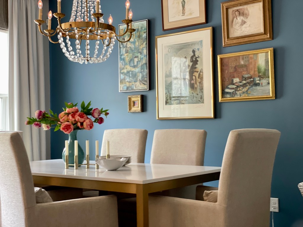 We situated a new formal dining table and chairs and an oak buffet console from her previous home at the forefront of the house for two reasons. They play double duty as reception/foyer space, as well as dining space, setting the tone for the home’s relaxed yet glamorous interiors. It’s a striking moment and highlights the homeowners love for beautiful art and objects. The sleek marble and metal table is the perfect transition between old and new, creating an updated classic style. The blue feature wall creates a stunning backdrop to the artwork and the soft brass metals add subtle sparkle to every vignette.