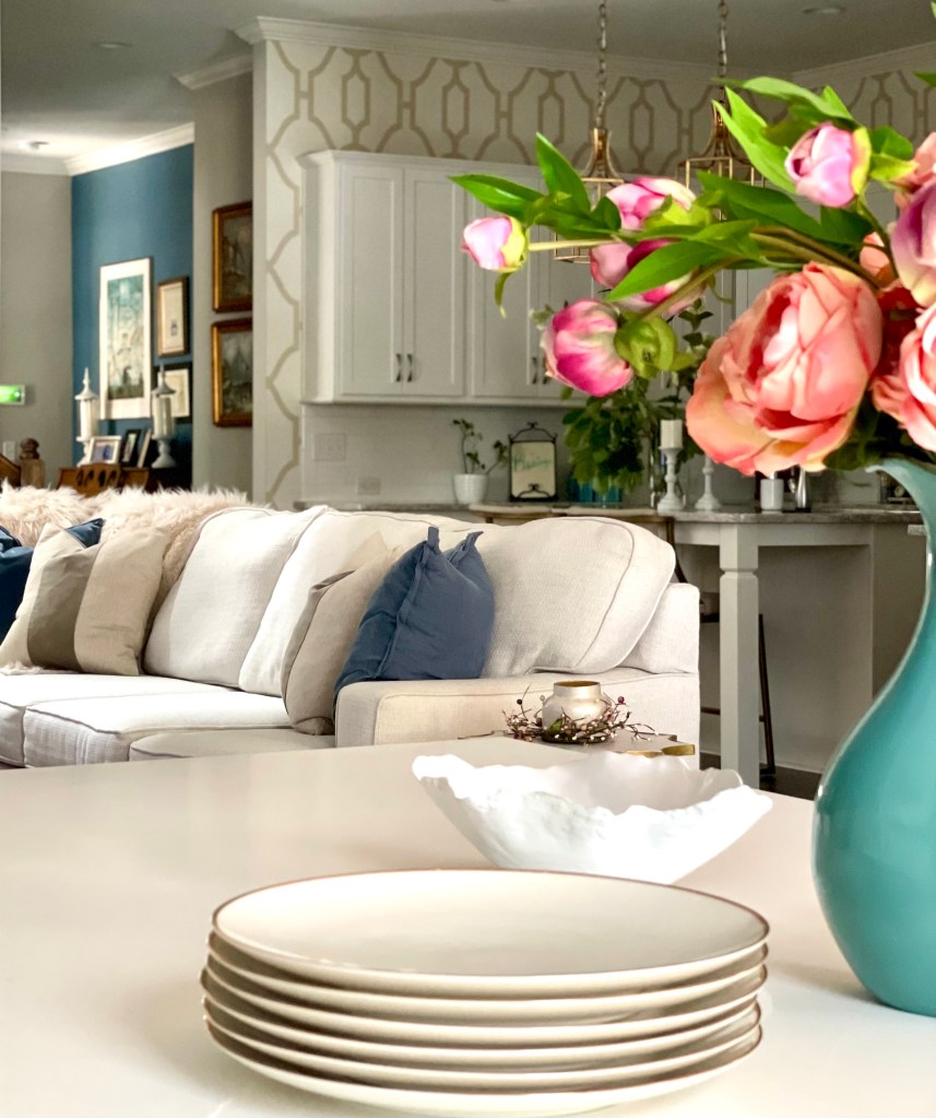 My client (and dear friend, I might add) had just sold her big, comforting home in New England. It was a place where she had been a happy wife and raised two beautiful daughters, now grown and adulting on their own. It was a home where, like so many of us, she had amassed an assortment of beautiful furnishings, china, books, fine art and incredible handmade rugs from the Middle East. A place where she had thrown countless birthday parties, dinners and celebrations; a home full of collections and memories and stories from a life well lived. Desiring to be more centrally located to both of her girls, she found herself downsizing and purchased a sparkling new, two story townhouse in Franklin, TN. She also found herself wondering how she would incorporate her cherished belongings from her previous home and life with the new furnishings, colors and interior aesthetic that she wanted to incorporate as a fresh new perspective on this new chapter of life. This is how we achieved just that and helped her fall in love with her surroundings all over again…