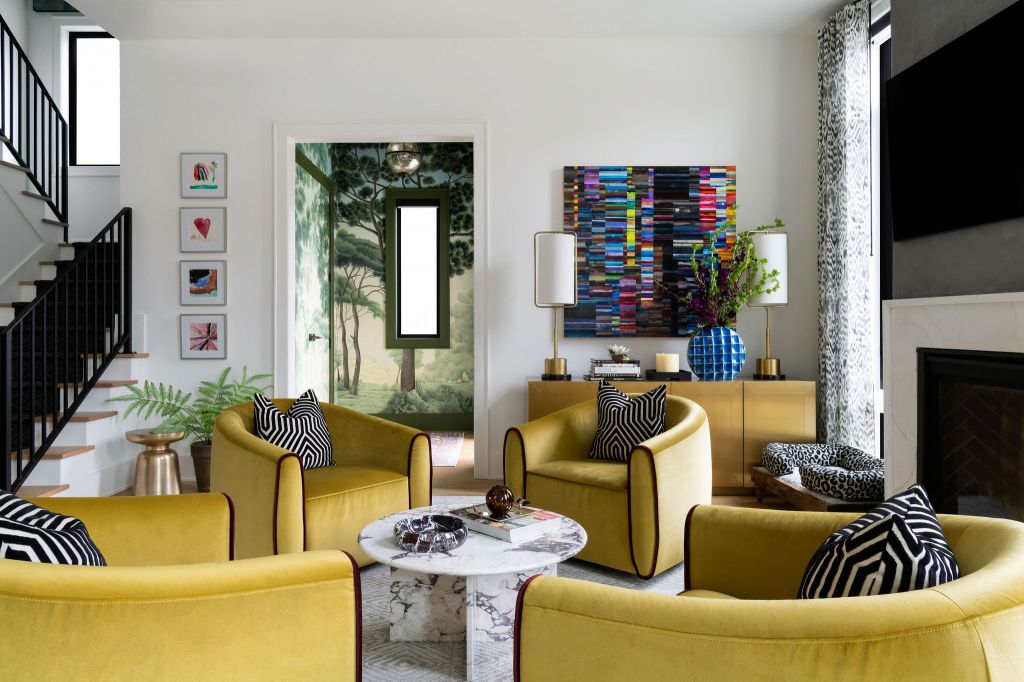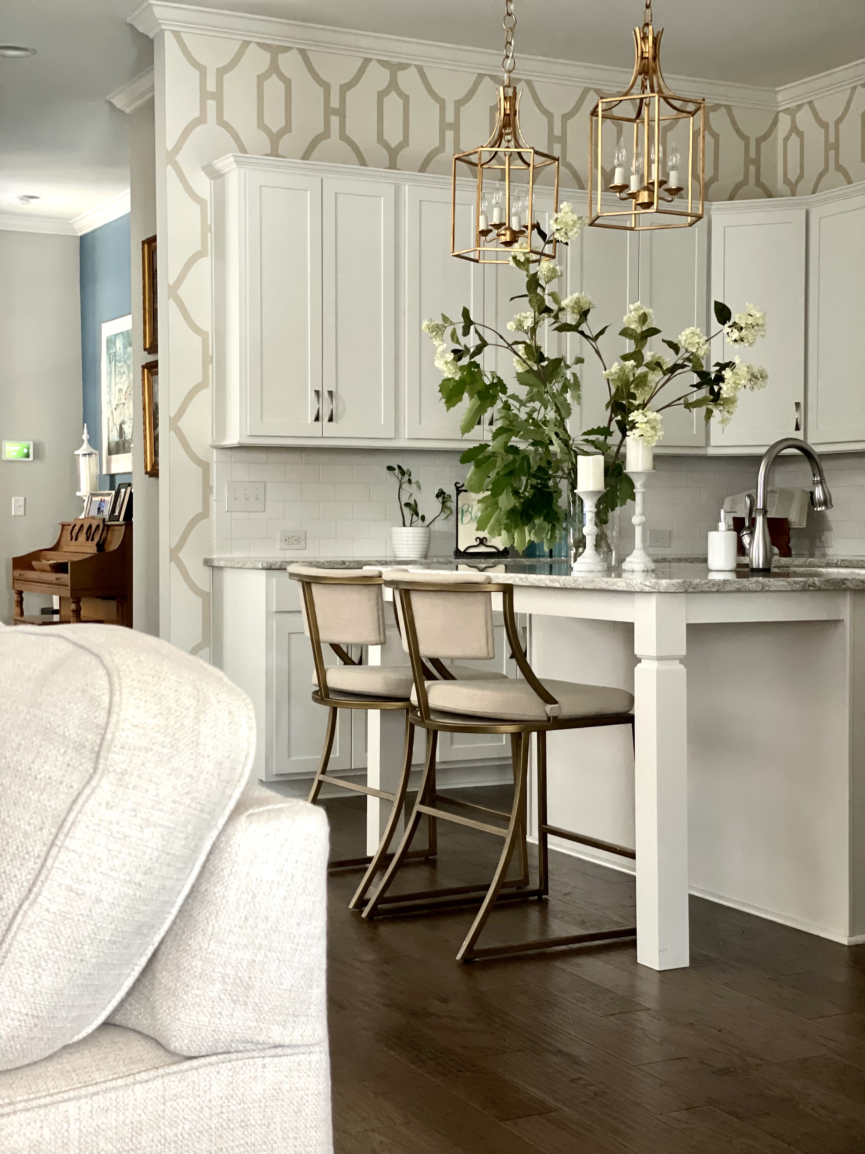 The living and kitchen areas are relaxed and warm and are accentuated by an unexpected trellis wallpaper in the kitchen, elevating the space to new heights! The gold leaf cage pendant lights are whimsical and elegant.