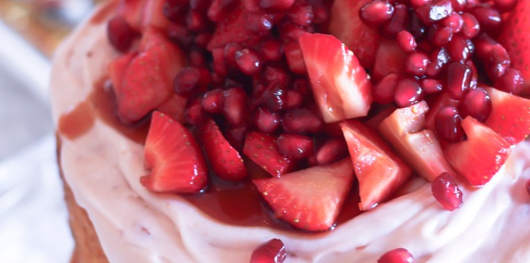 Lemon Ricotta Cake with Strawberry Frosting and Balsamic Strawberries