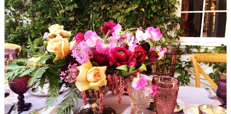 We arrived upon this sexy and awe inspiring tablescape scene. Never has a floral arrangement captured the essence of a bride more than this one. The colors are romantic…an infusion of red wine and ruby lipstick and wild playfulness! The linens are the softest lavender, glasses are crystal, purple and amethyst, ribbons are the palest blush. I could go on and on because, for me, this is pure delight.
